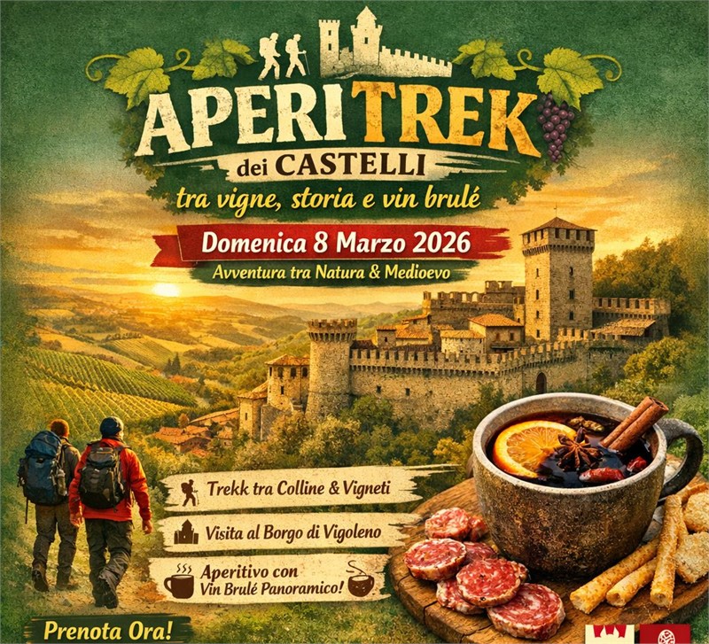 Domenica 8 marzo 2026, l’Aperi Trek dei Castelli conduce i partecipanti lungo un itinerario suggestivo di circa 9 km, tra strade campestri, sentieri e piccoli tratti asfaltati, attraversando vigneti, scorci rurali e panorami che si aprono verso la pianura.