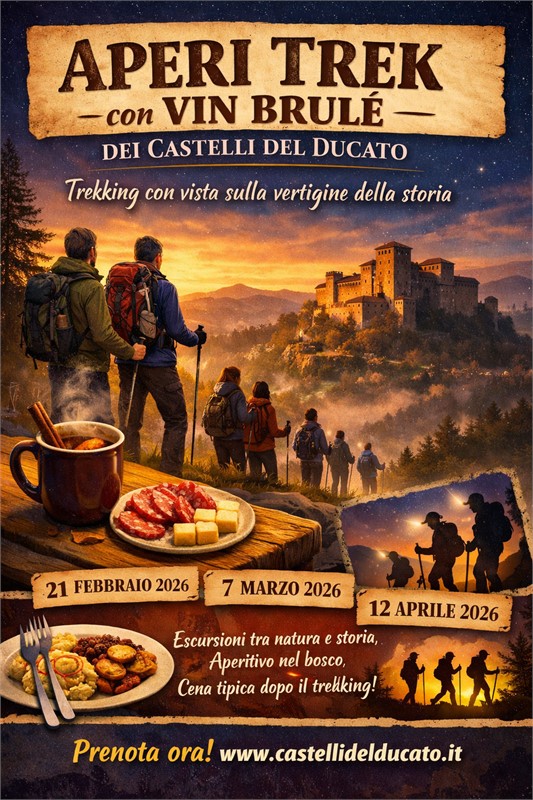Aperi Trek con vin brulè dei Castelli del Ducato: trekking con vista sulla vertigine della storia.