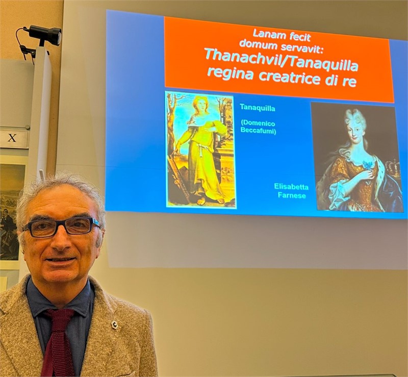 Ve ne parliamo perché Macellari ha portato un accostamento - certamente in omaggio al nostro territorio - che ci ha sorpreso trovando una analogia tra la regina Tanaquilla - “creatrice di re” (VII-VI sec. a.C.) moglie di Tarquinio Prisco, originariamente noto come Lucumone, quinto re di Roma - e la nostra Elisabetta Farnese (1692-1766) l'ultima discendente della dinastia farnesiana, principessa di Parma e Piacenza e poi Regina consorte di Spagna, moglie di Filippo V.