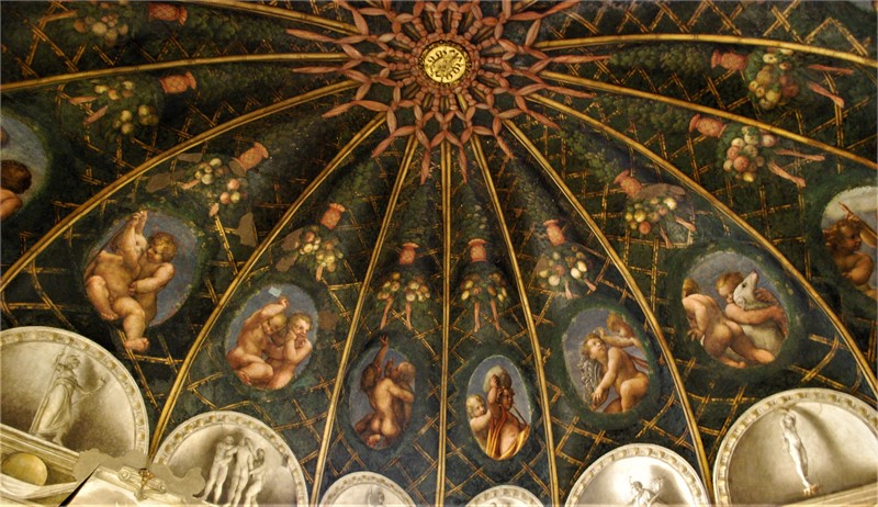 La stanza affrescata da Araldi propone una ricca decorazione a grottesche e candelabre dipinte, sul fondo blu della volta, in cui si inseriscono scene sacre, come quelle del Vecchio e del Nuovo Testamento illustrate in tondi e riquadri, e profane con putti, animali fantastici e rosoni in stucco dorato.