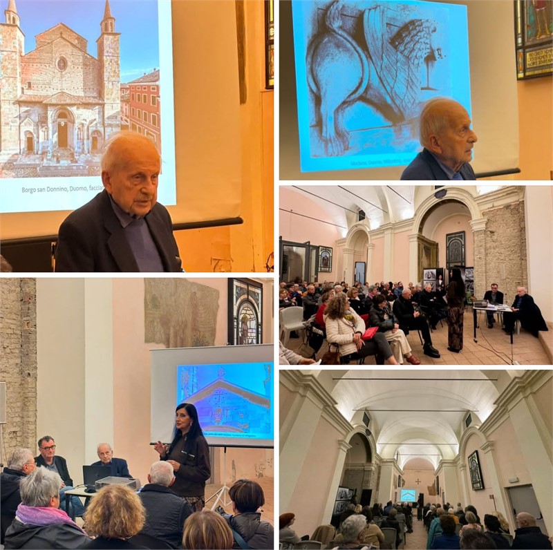 “Con la sapienza che lo connota il professore ha dissertato sul Cristo Pantocratore e i simboli evangelici murati nella zona absidale del duomo di Fidenza – ha evidenziato la vicesindaca con delega alla Cultura Maria Pia Bariggi – Procedendo per analogie, considerando la planimetria della Cattedrale, edificio costruito in tre tempi, in particolare con la zona absidale e la cripta aggiunte intorno al 1270, tenuto conto del percorso dei pellegrini, presenta la seguente ipotesi: le sculture dell’abside appartengono al grande portale sud della Cattedrale. Smontate nel 1600, nel XIX secolo sono collocate dove ora li ammiriamo. L’officina antelamica aveva scolpito per Borgo San Donnino un grande portale simile a quello del Battistero di Parma.